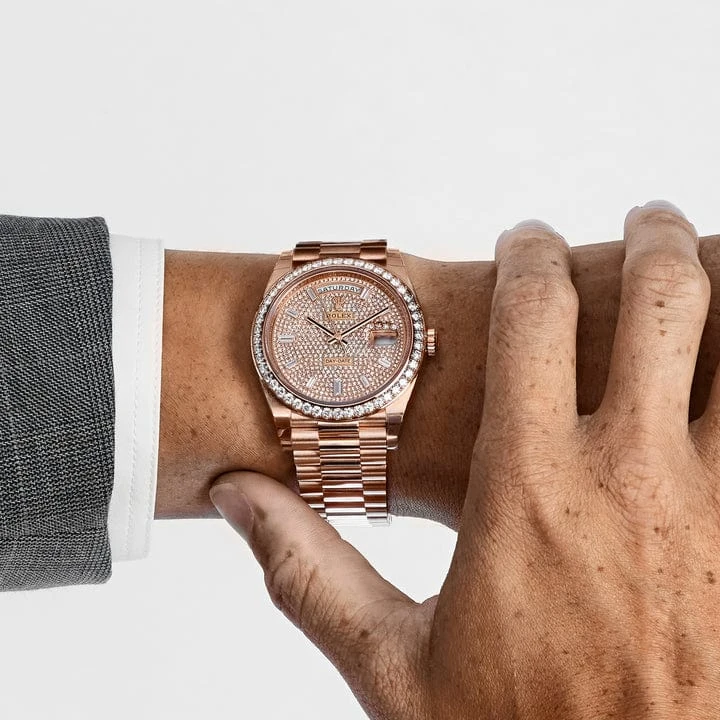 The Rolex Day-Date 228345RBR is the pinnacle of prestige in the Rolex Day-Date collection. Crafted in 18K rose gold and adorned with a diamond-set bezel and diamond-set dial, this extraordinary timepiece is both a technical achievement and an aesthetic masterpiece. It represents the ultimate expression of elegance, rarity, and horological prestige.